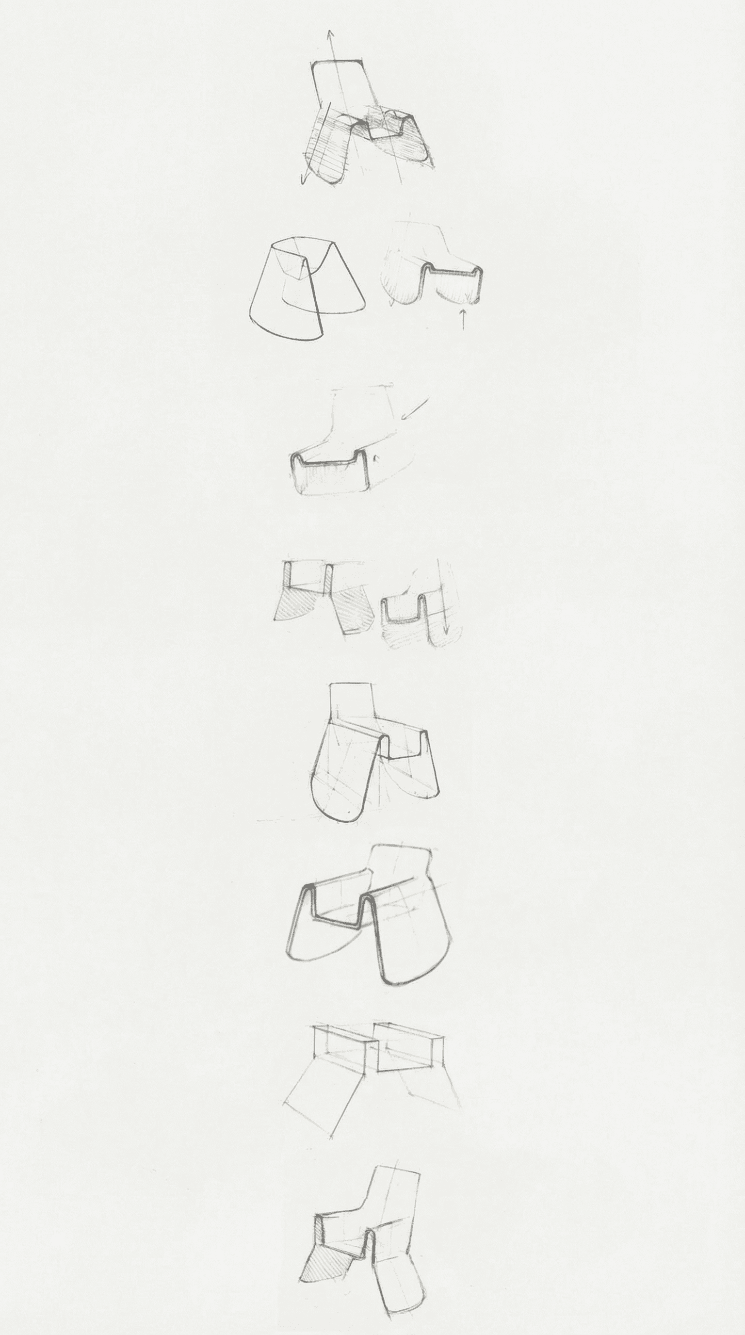 My original ideation was for a stackable rocking chair printed with a non-planar toolpath. Weight and practicality concerns scrapped the stackable idea pretty early, so I was left with a non-planar rocking chair to execute. I chose to explore different ideas using hand sketching and generative ai tools like Vizcom to rapidly realize ideas.